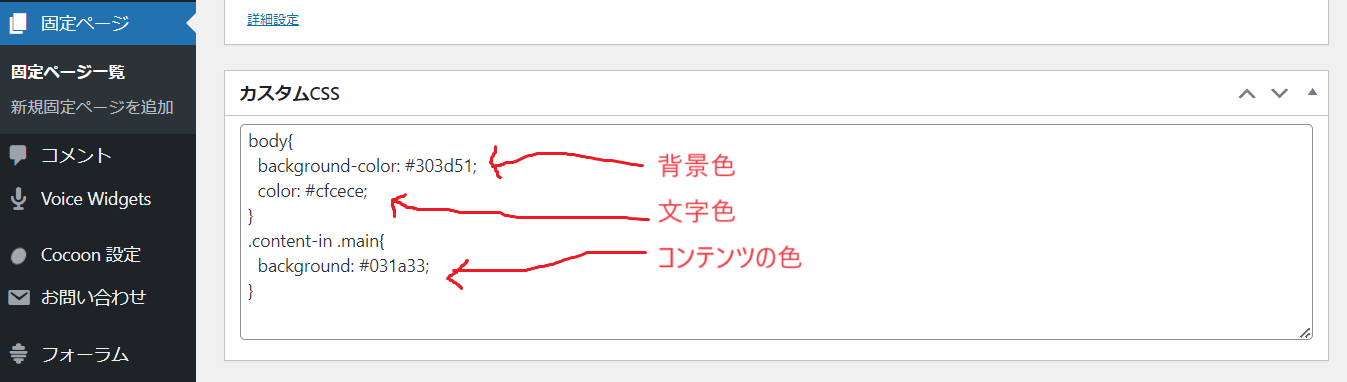 「固定ページを編集」から下の方へ行き、「カスタムCSS」に下記を記載しました。